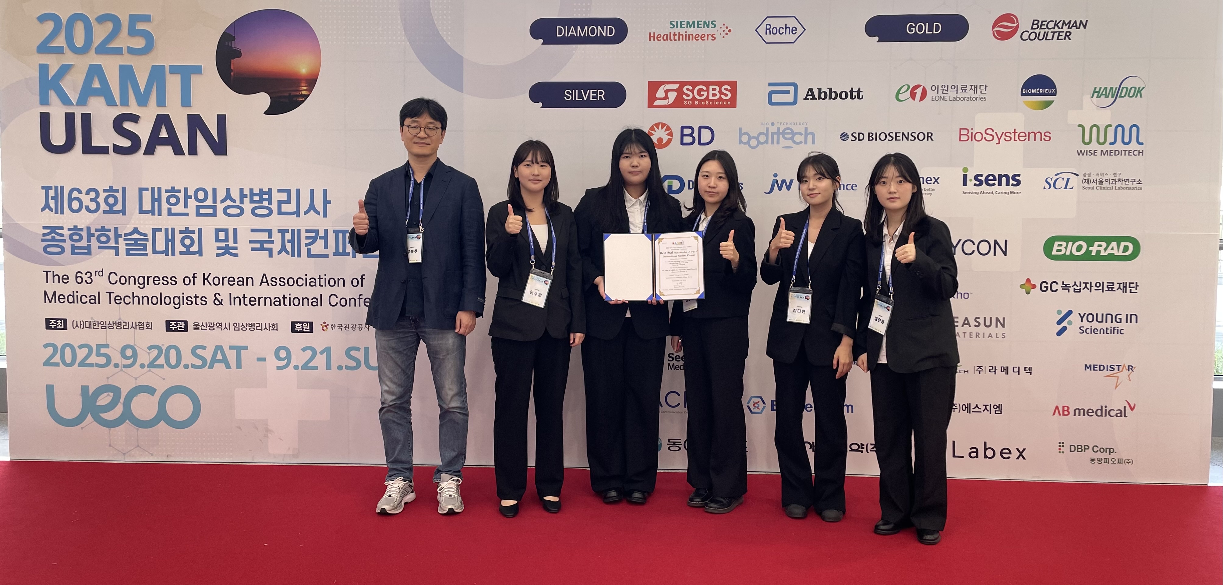 건양대 임상병리학과, 국제학생포럼 본선 진출 및 학술상 수상 쾌거 건양대학교(총장 김용하) 임상병리학과(학과장 양승주)는 지난 2025년 9월 20일(토) 개최된 제63회 대한임상병리사 종합학술대회 및 국제컨퍼런스 국제학생포럼(International Student Forum)에서 본선에 진출하여 학술상을 수상하는 괄목할 만한 성과를 거두었다.
