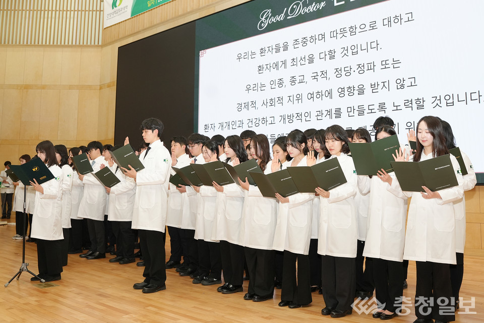 건양대 의과대, 예비 의사들 화이트가운 세레머니 건양대학교 의과대학이 예비 의사들의 새로운 이정표를 세웠다. 임상 현장에 나서기 전 마음가짐을 가다듬는 전통 행사가 올해도 이어졌다. 의과대학은 24일 오후 대전 메디컬캠퍼스 리버럴아츠홀에서 임상실습을 앞둔 본과 5학년 진급 예정 학생 51명이 참석한 가운데 '11회 화이트가운 세레머니 in 참 키움'을 열었다. 행사는 2015년부터 이어진 의과대학의 상징적 의식으로, 실습을 시작하는 학생들이 스스로의 책임을 되짚는 시간으로 자리 잡았다. 행사장에는 학생과 학부모, 가족, 교직원 등 약 200명이 모여 예비 의사들의 첫걸음을 함께 지켜봤다. 건양교육재단 설립자 김희수, 김용하 총장, 배장호 의료원장, 구훈섭 학장, 양정경 동문회장이 참석해 학생들을 격려했다. 개회와 축사에 이어 지도교수와 가족이 학생들에게 화이트가운을 입혀주는 착복식이 진행됐다. 이어진 굿닥터 선서에서 학생들은 환자 중심 진료와 생명 존중의 가치를 마음에 새기며, 임상 현장에서 지켜야 할 윤리와 책임을 다시 확인했다. 축하공연은 긴 여정을 앞둔 학생들에게 응원의 메시지를 전했다. 김용하 총장은 "여러 해 동안 엄격한 교육 과정을 성실히 걸어온 결과가 오늘의 자리로 이어졌다"며 "이 순간을 계기로 실력과 따뜻함을 함께 갖춘 의료인으로 성장하길 바란다"고 말했다. 구훈섭 학장은 "임상실습은 교실을 떠나 환자를 직접 마주하는 과정"이라며 "오늘의 다짐을 품고 겸손한 자세로 배움에 임해달라"고 당부했다. 건양대학교 의과대학은 학생들이 의료인의 윤리의식과 사회적 책무를 체계적으로 익히도록 교육과 지원을 이어갈 방침이다. 환자와 사회의 신뢰를 쌓는 과정이 교육 현장에서부터 이어지고 있다 출처 : 충청일보(https://www.ccdailynews.com)