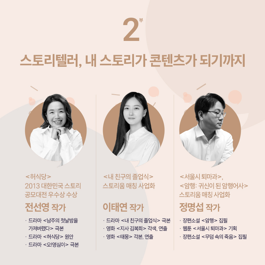 문화체육관광부와 한국콘텐츠 진흥원이 주최·주관하는 <2025 더 스토리 콘서트>에 초대합니다! ? 창작의 첫 걸음을 떼려는 예비창작자 ? 현직 작가들의 생생한 경험과 노하우를 배우고 싶은 분 ? 창작물을 사업화 하는 과정에 대한 궁금증이 있는 분 예비·신진 창작자분들이 궁금했던 모든 것들을 작가님들의 경험담을 통해 해소시켜드립니다. 참가 신청 페이지? https://forms.gle/KHdEA83T3qdTTbvR6